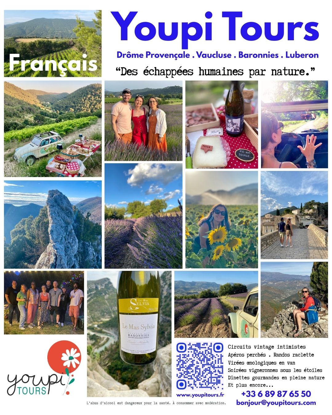 Today I feel I am more than ever ready to rely on my 10-year wine tourism experience (Cave de Rasteau and Chêne Bleu) and bicultural professional approach to share my personal vision of the true mission of a touristic & wine tour guide. Halfway between uncomprimising self-demand, professionalism, flair for improvisation and extreme conviviality.
